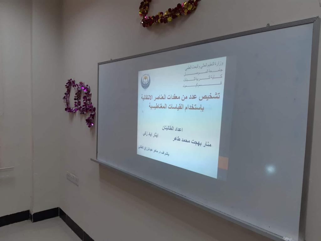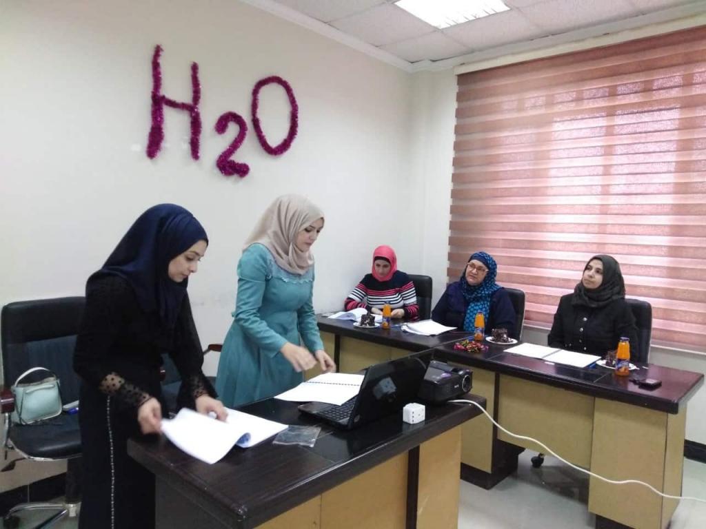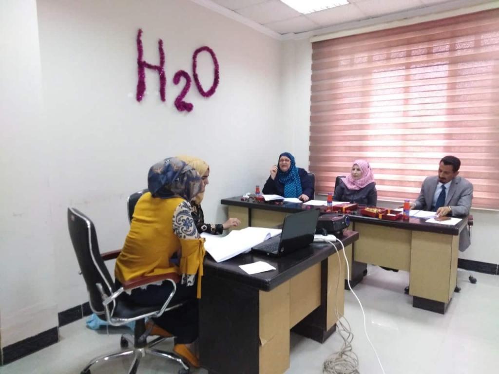 بإدارة أ.م.د. فرحة خلف عمر رئيس قسم الكيمياء في كلية التربية للبنات، بدأت مناقشات بحوث التخرج لطالبات المرحلة الرابعة في القسم، وذلك استكمالاً لمتطلبات نيل شهادة البكالوريوس في تخصص الكيمياء، اذ تشكلت لجان المناقشة من الاساتذة المختصين والمشرفين على الطالبات، وقد أظهرت طالبات القسم دفاعاً علمياً متميزاً مما عكس أثر جهود اعضاء الكادر التدريسي للقسم خلال السنوات الاربع الماضية، بالتوفيق لجميع طالباتنا في اختبارتهنّ النهائية.