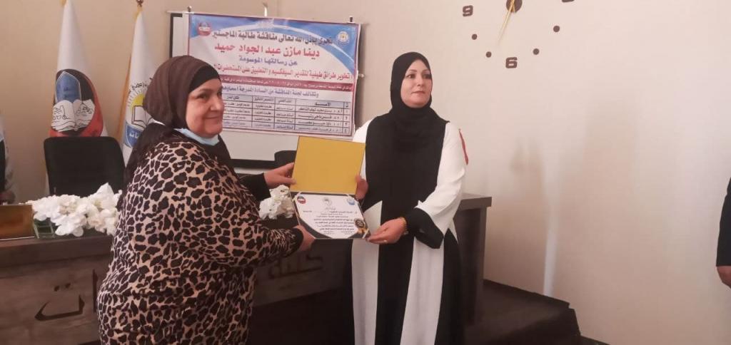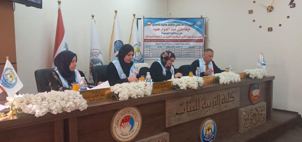 بحضور السيدة عميد الكلية، ناقش قسم الكيمياء رسالة الماجستير الموسومة (تطوير طرائق طيفية لتقدير السيفيكسيم والتطبيق على المستحضرات الصيدلانية) ، لطالبة الماجستير (دينا مازن عبد الجواد حميد) التي تضمنت رسالتها خمسة فصول جاء في الفصل الاول مقدمة بسيطة للعقار وبعض الطرائق التحليلية التي استخدمت في تقدير المركب الدوائي من الباحثين السابقين فيما تضمن الفصل الثاني طريقة طيفية لتقدير المركب الدوائي باستخدام تفاعل الاكسدة باستخدام هيبو كلورات الصوديوم في الوسط الحامضي وطبقت الطريقة بنجاح على المستحضرات الصيدلانية التي اخذت عيناتها من الكبسول والاقراص وتناول الفصل الثالث تطوير طريقة تقدير السيفكسيم باستخدام تفاعل الاقتران التاكسدي مع 1,2 فثيلين ثنائي امين بوجود العامل المؤكسد بيريودات البوتاسيوم وكانت الطريقة كفوءة جدا حسب النتائج والبيانات المستحصلة وتضمن الفصل الرابع تطوير طريقة تقدير المركب الدوائي من خلال تفاعل الاقتران التاكسدي ايضا مع بارا امينو ثنائي فنيل امين بوجود العامل المؤكسد داي كرومات البوتاسيوم الذي اعطى تفاعلا ايجابيا وطريقة ناجحة حسب النتائج والقراءات المستحصلة فيما تناول الفصل الخامس والاخير تطوير طريقة طيفية لتقدير المركب الدوائي من خلال تفاعل الازوتة والاقتران مع كاشف على اقتران السيفكسيم المؤزوت مع الكاشف المستخدم في الوسط القاعدي وكانت الطريقة ايضا ناجحة ومطورة وطبقت جميع الطرائق المذكورة اعلاه على المستحضرات الصيدلانية التي اخذت عيناتها من الكبسول والاقراص وترأس لجنة المناقشة أ.م.د. يسرى مجيد شهاب وعضوية كل من أ.م. د. قبس ناجي رشيد و أ. م. د. داود حبو محمد وعضوية واشراف أ.م.د. فرحة خلف عمر وبعد مناقشة مستفيضة اجيزت الرسالة بتقدير امتياز وذلك يوم الاثنين الموافق ٢٧ ايلول ٢٠٢١ ، مبارك للطالبة ومشرفها وقسم الكيمياء خصوصا وكلية التربية للبنات عموما هذا المنجز العلمي المتميز