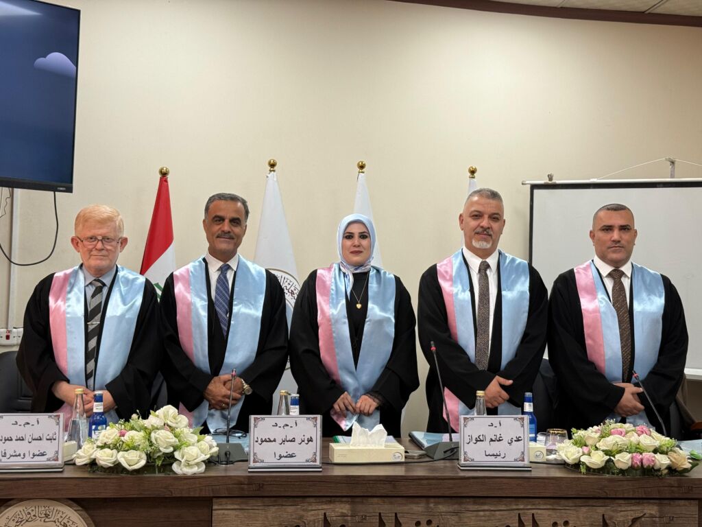 وقد حضر جانبًا من المناقشة كلٌّ من السيدة عميدة الكلية الاستاذ المساعد الدكتورة شذى حازم كوركيس، والسيد معاون العميد للشؤون العلمية، تأكيدًا على دعم الكلية للجهود البحثية الهادفة والمتميزة.