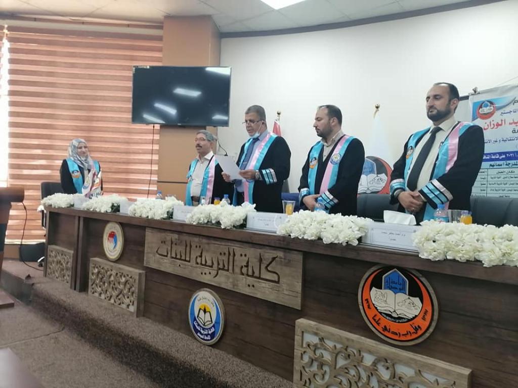ناقش قسم الكيمياء رسالة الماجستير الموسومة بـ(تحضير ودراسات طيفية لعدد من معقدات العناصر الانتقالية وغير الانتقالية مع ليكاندات قواعد شيف)، لطالبة الماجستير (زينب ثائر عبد الحميد جاسم) التي تضمن رسالتها تحضير وتشخيص عدد من المعقدات الجديدة للكوبلت (II), النيكل (II), النحاس (II), الخارصين (II), الكادميوم (II) والزئبق (II) مع ليكاندات من نوع قواعد شيف ثنائية الأمين المتماثلة وهي (L1, L2, L3, L4, L5).تم تحضير هذه المعقدات من التفاعل المباشر بين كلوريد الفلز (II) مع قواعد شيف المحضرة في محيط متعادل . وقد شخصت الليكاندات والمعقدات المحضرة باستخدام تقنيات مختلفة منها الفيزيائية (درجة الانصهار والتوصيلية المولارية) والقياسات الطيفية (طيف الأشعة المرئية فوق البنفسجية, وطيف الأشعة تحت الحمراء, وطيف الرنين النووي المغناطيسي للبروتون فضلاً عن القياسات المغناطيسية والتحليل الدقيق للعناصر.استنتج من هذه الدراسات أن الليكاندات الخمسة تعطي معقدات متعادلة غير الكتروليتية أو الكتروليتية بنسبة (2:1) ومن هذه الدراسات المختلفة تم التعرف على بنيات المعقدات والتي تعددت بين ثماني السطوح ورباعي السطوح والمربع المستوي.ترأس لجنة المناقشة أ. د. حكمت محمد علي، وعضوية كلاً من أ.م. د. عاصم عادل صباح، وم.د. أحمد مظفر محمد، وعضوية واشراف أ. د. ماهر عبد الرزاق محمد، وبعد مناقشة مستفيضة اجيزت الرسالة بتقدير ممتاز، وذلك يوم الأحد الموافق ٢٩ آب ٢٠٢١، مبارك للطالبة ومشرفها وقسم الكيمياء خصوصا وكلية التربية للبنات عموما هذا المنجز العلمي المتميز.