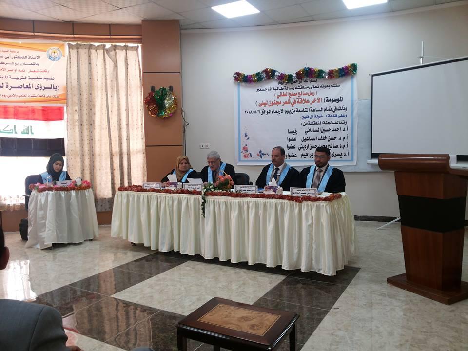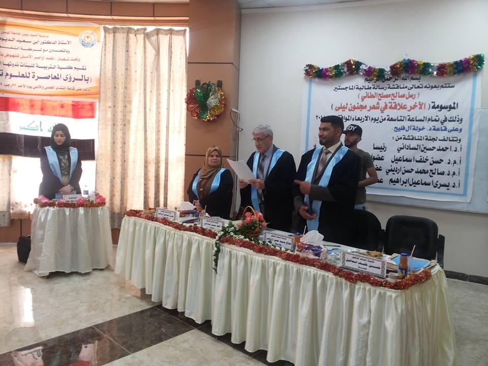 جرت بعون الله تعالى في كلية التربية للبنات / قسم اللغة العربية المناقشة العلنية لطالبة الماجستير رسل صالح مصلح عن رسالتها الموسومة بـ : (الآخر علاقةً في شعر مجنون ليلى) ، وكانت مناقشة علمية رصينة ، منحت الباحثة في ختامها شهادة الماجستير بتقدير (جيد جدا عال) ، وذلك في تمام الساعة التاسعة صباحا من يوم الأربعاء الموافق 2 /5 /2018م ، على قاعة أ.د. خولة آل فليح . وقد تألفت لجنة المناقشة من الأساتذة : 1. أ.د. أحمد حسين الساداني……………رئيساً 2. أ.م.د. حسن إسماعيل خلف ………..عضواً 3. أ.م.د. صالح محمد ارديني ……..عضواً 4. أ.د. يسرى إسماعيل إبراهيم…عضواً ومشرفاً مبارك للطالبة والمشرفة ، وهنيئا لقسم اللغة العربية خصوصا ، وكلية التربية للبنات عموما ، على هذا المنجز العلمي الرائع.