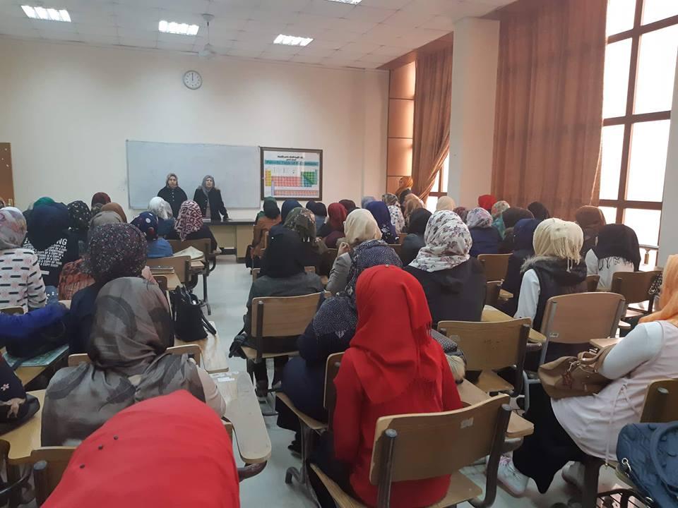 برعاية السيدة رئيسة قسم الكيمياء الاستاذ المساعد الدكتورة فرحة خلف عمر، التقت الاستاذ المساعد الدكتورة نجلة هشام مسؤولة الارشاد و الدكتورة رنا تحسين بطالبات المرحلة الاولى قسم الكيمياء في محاضرة ارشادية نظرا للعدد الكبير المقبول في الكلية، تناولت امور ارشادية تخص الالتزام بالدوام وكذلك ارشادات تخص الزي المحتشم.