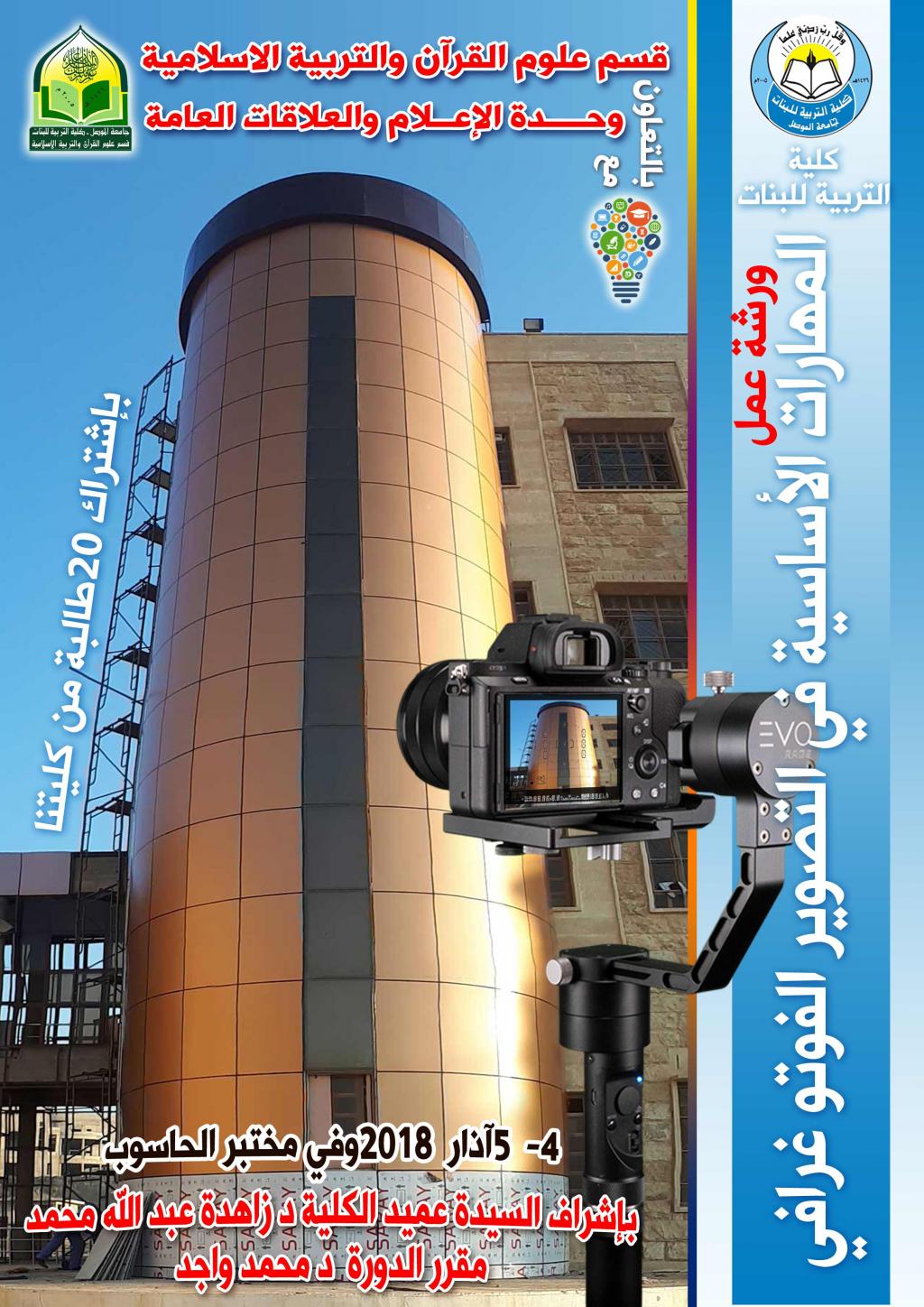 تحت اشراف السيدة عميد كلية التربية للبنات الدكتورة زاهدة عبد الله محمد وبالتعاون مع قسم علوم القرآن والتربية الاسلامية تقيم وحدة الاعلام والعلاقات العامة في كليتنا ورشة عمل عنأساسيات التصوير الفوتوغرافي وذلك يومي الاحد والاثنين الموافق4 – 5 آذار 2018 الساعة 11 صباحا الى 1,00 ظهرا وفي مختبر الحاسوب،وبواقع 50 مشاركة ويتم التسجيل عند مقرر الورشة الدكتور محمد واجد.