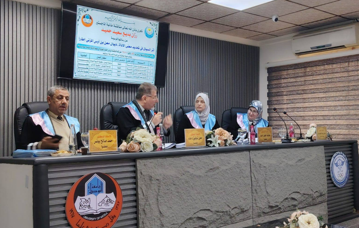 شهد قسم اللغة العربية في كلية التربية للبنات / جامعة الموصل يوم الأحد الموافق 14/12/2025 مناقشة رسالة الماجستير الموسومة «أثر السياق في تحديد معنى الأداة – ديوان معن بن أوس المزني إطارًا» للطالبة رزان بديع سعيد.