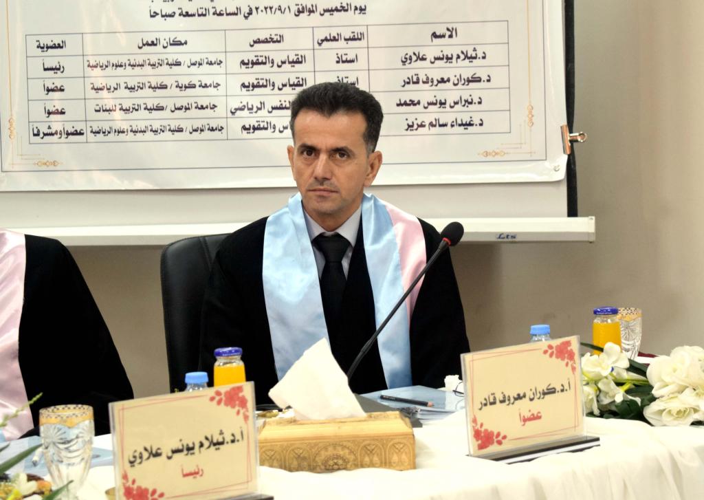 ناقشت جامعة الموصل / كلية التربية للبنات / قسم التربية البدنية وعلوم الرياضة رسالة الماجستير الموسومة (نسب مساهمة بعض عناصر اللياقة البدنية لمواقف سلوكية في اختبارات الرشاقة لطالبات التربية البدنية في جامعة الموصل) للطالبة (أنفال راكان محمود داؤد) ، يوم الخميس الموافق ١ / ٩ / ٢٠٢٢، في قاعة المناقشات والمؤتمرات بمبنى عمادة الكلية.وحضرت السيدة عميد الكلية الأستاذ الدكتورة ضمياء علي عبدالله جانباً من المناقشة ، فضلاً عن السيد المعاون العلمي الأستاذ الدكتور داود حبو محمد وعدد من أساتذة الكلية .وقد هدف البحث الى:-التعرف على العلاقة بين عناصر اللياقة البدنية للمواقف السلوكية لاختبارات الرشاقة لطالبات كلية التربية البدنية في جامعة الموصل.-التعرف على نسبة مساهمة بعض عناصر اللياقة البدنية للمواقف السلوكية لاختبارات الرشاقة لطالبات كلية التربية البدنية في جامعة الموصل.اما الإطار النظري فقد تضمن:الرشاقة، والرشاقة كصفة مركبة وكذلك أشكال المواقف السلوكية لاختبارات الرشاقة والدراسات المرتبطة .وتألفت لجنة المناقشة من الأساتذة :١- أ.د. ثيلام يونس علاوي ….. رئيساً.٢- أ.د. كوران معروف قادر …… عضواً.٣- أ.د. نبراس يونس محمد …… عضواً.٤- أ.د. غيداء سالم عزيز … عضواً ومشرفاً.وبعد مناقشة علمية مستفيضة ودفاع الطالبة عن رسالتها ، أجيزت بتقدير امتياز .