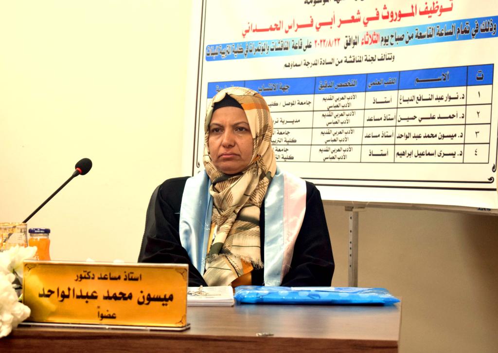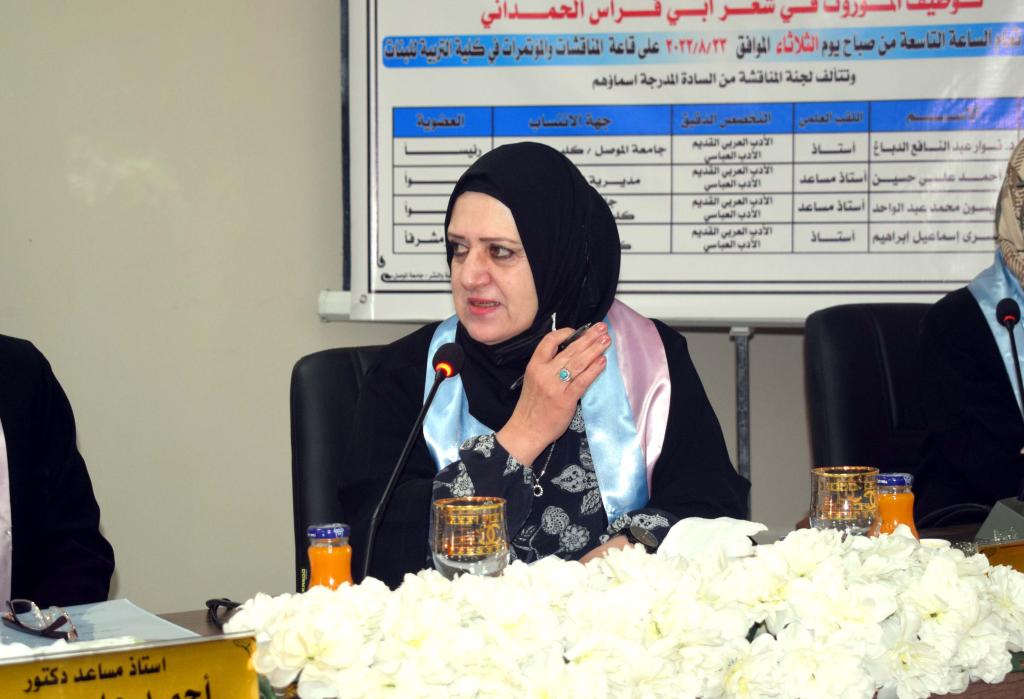 ناقشت جامعة الموصل / كلية التربية للبنات / قسم اللغة العربية رسالة الماجستير الموسومة بـ:(توظيف الموروث في شعر أبي فراس الحمداني) للطالبة بيداء خلف موسى محمد ، يوم الثلاثاء الموافق ٢٣ / ٨ / ٢٠٢٢، في قاعة المناقشات والمؤتمرات بمبنى عمادة الكلية.تناولت الدراسة الموروث الذي حظي بأنواعِه بعنايةِ الدارسين؛ وذلك للبصمة الواضحة التي تركها على الأدب شعرِه ونثرِه؛ فالموروثُ لم يعد محصورًا بما تركه الأولُ للأخِر، بل أصبح مرتبطًا بالسُّلوك البشري والحياةِ الحضاريةِ للجماعاتِ والأفراد، بوصفه مخزونًا غنيّاً يعود إليه الشاعرُ؛ فالقصيدةُ أضحت تتشكلُ في إطارِ المزاوجةِ بين الواقعِ والموروثِ، وتوظيف الموروث يمنحها طاقاتٍ تعبيريةٍ لا حدود لها.وتألفت لجنة المناقشة من الأساتذة :١- أ.د. نوار عبدالنافع الدباغ ….. رئيساً.٢- أ.م.د أحمد علي حسين …… عضواً.٣- أ.م.د. ميسون محمد عبد الواحد …… عضواً٤- أ.د. يسرى إسماعيل إبراهيم … عضواً ومشرفاً.وبعد مناقشة علمية مستفيضة ، ودفاع الطالبة عن رسالتها أجيزت بتقدير امتياز .