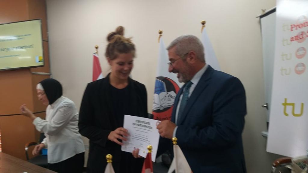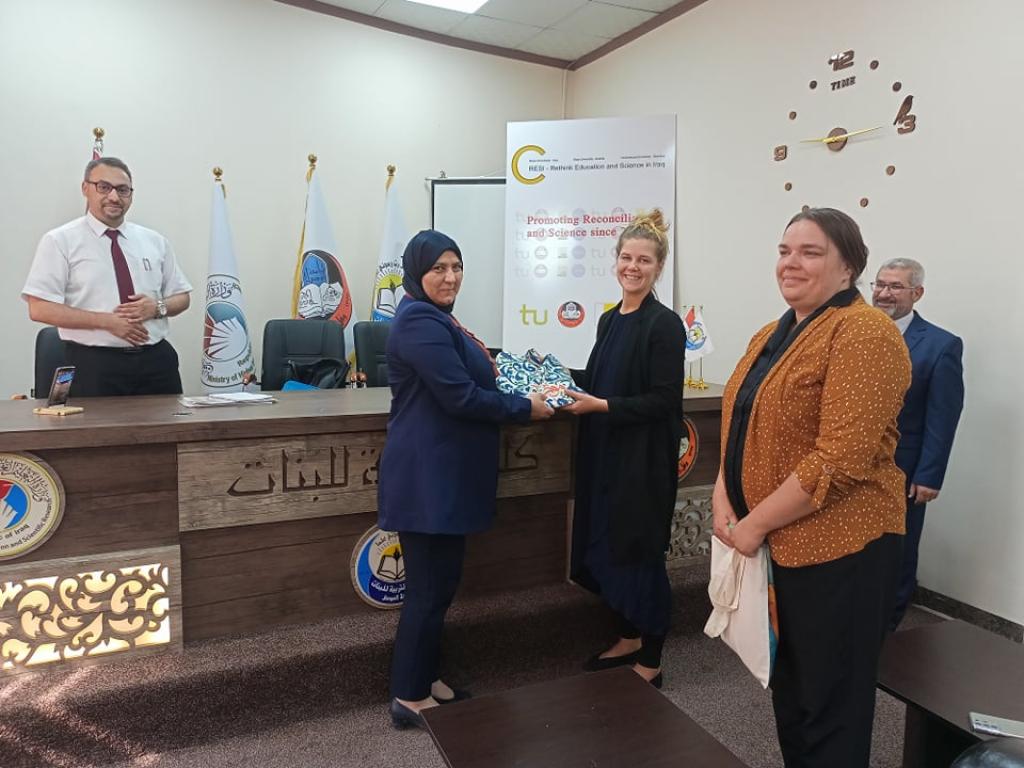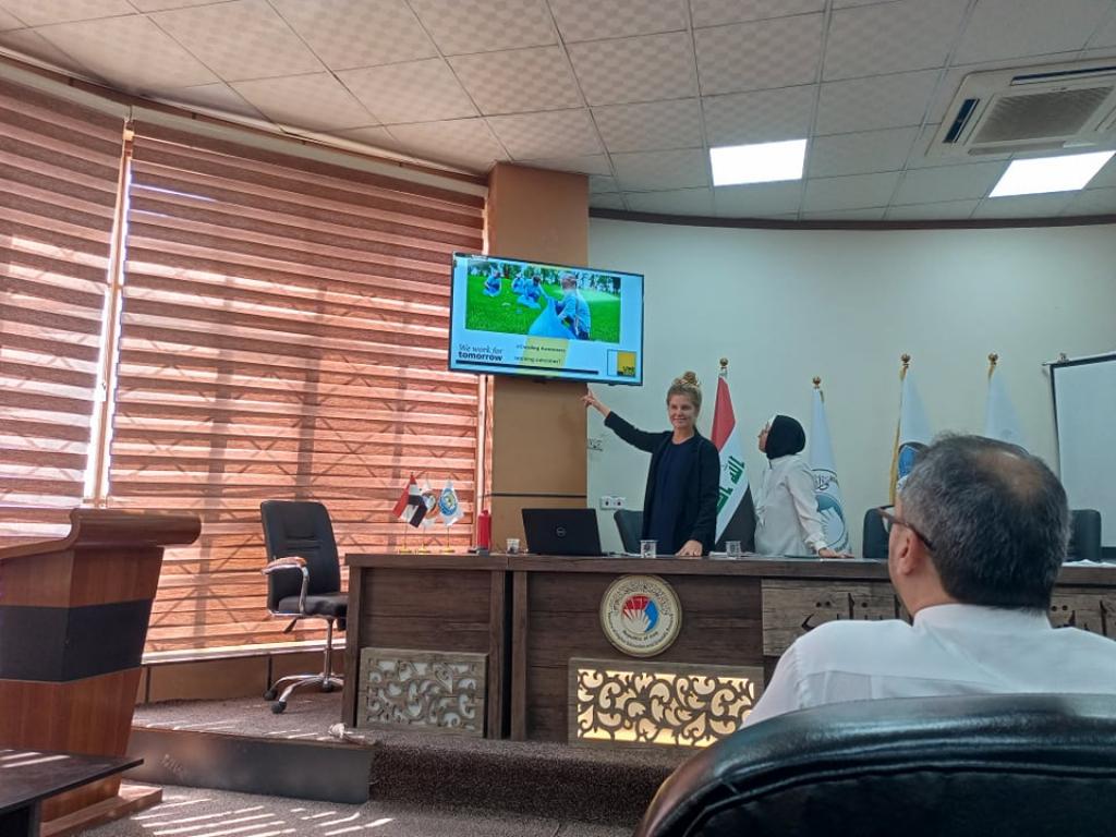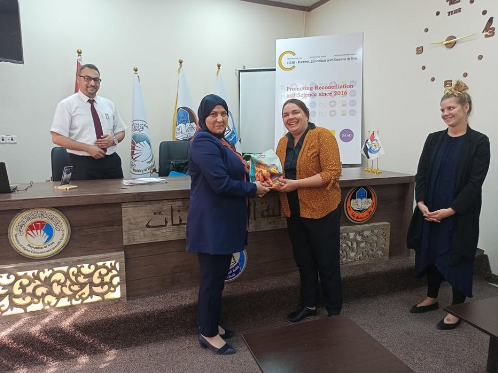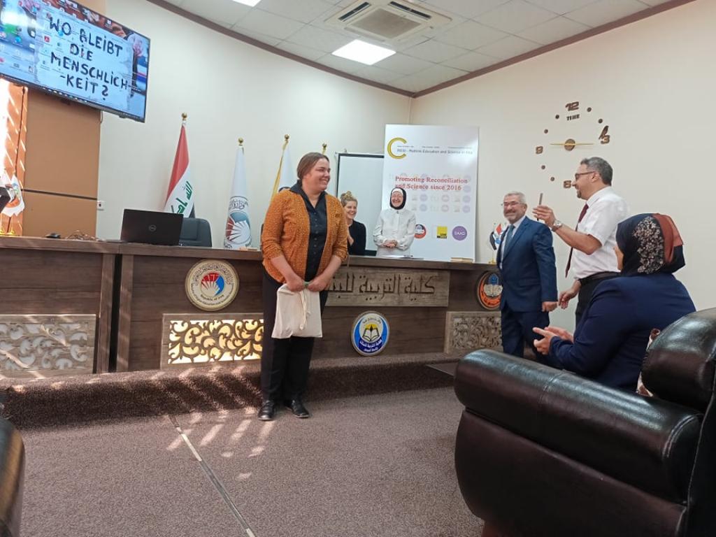 كلية التربية للبنات تشتضيف ورشة العمل الدولية التي أقامتها جامعة كراز / النمسا وجامعة تي يو دورتموند بالتعاون مع جامعة الموصل، والموسومة بـ”طرق التعليم المتكامل”، اذ ألقت الاستاذة ميلينا تيناشير جامعة كراز / النمسا محاضرتها الموسومة بـ”الاستجابة للتحديات العالمية. A response to global challenges.” وذلك يوم الخميس الموافق 23 أيلول 2021، بدأت الورشة بكلمة ترحيبية من الاستاذ الدكتور انور الفيضي ممثل منسقي برنامج التعاون المشترك، ألقى بعدها الاستاذ المساعد الدكتور محمد واجد مسؤول الاعلام في الكلية كلمة الكلية التي وضح مساهمة كلية التربية للبنات في انشاء مدرسات تربويات متمكنات علمياً وعملياً خدمة للمدينة، كما تم تقديم فلم عن الكلية قبل الاعمار وبعده، ليطلع السادة الضيوف على الجهود المبذولة من قبل رئاسة الجامعة فضلاً عن ادارة الكلية في اعادتها الى سابق عهدها وافضل، حضر جانباّ من الورشة لالاستاذ الدكتورة هايك فندت من جامعة دورتموند الالمانية والاستاذ الدكتور منير سالم طه مساعد رئيس الجامعة للشؤون العلمية، تناولت ورشة العمل أهمية الاستدامة في العملية التعليمية، وكيفية انشاء جيل من الناشئة يهتمون بالبيئة ويساعدون على نشر هذه الثقافة في المجتمع، بعدها فتح باب النقاش والاسئلة التي اجابتها عنها الاستاذة المحاضرة، وقد ترجم جزء من الورشة المدرس المبدع محمود البكوع (مسؤول العلاقات العامة في الكلية).