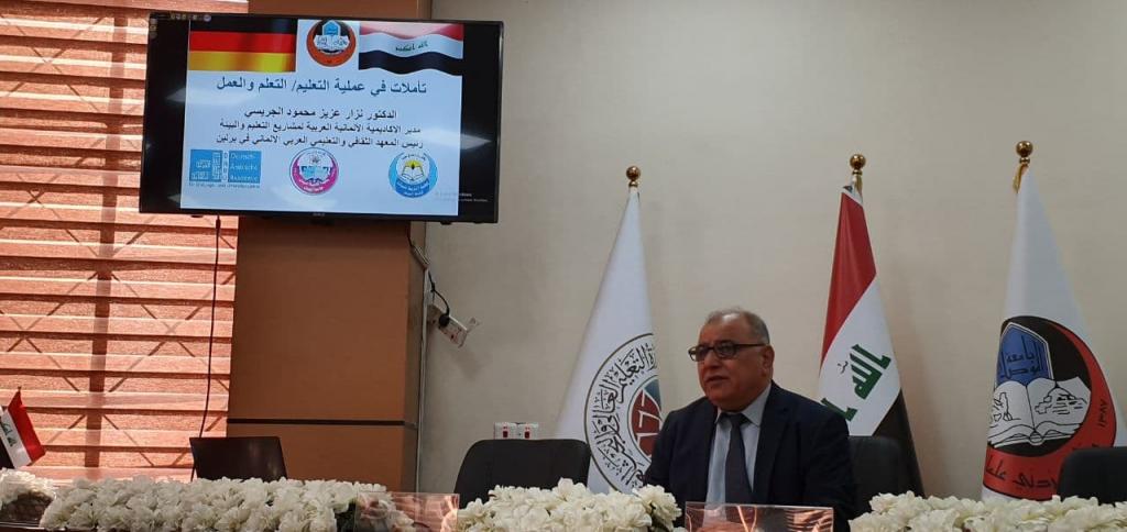 ضمن توجهات عمادة كلية التربية للبنات في استضافة الاساتذة الزائرين من الجامعات العالمية، استضاف قسم الكيمياء الدكتور نزار عزيز محمود الجريسي مدير الاكاديمية الالمانية العربية لمشاريع التعليم والبيئة ورئيس المعهد الثقافي والتعليمي العربي في برلين / جمهورية المانيا، والذي القى محاضرة قيمة على طالبات الصف الرابع / قسم الكيمياء والتي كانت بعنوان (تأملات في عملية التعليم / التعلم والعمل) خاطب فيها طالباتنا الخريجات ان شاء الله عن كيفية التعليم والتعلم والتعامل مع الطالب مستقبلاً، مؤكداً على ضرورة عدم الإعتماد على النظام التلقيني التقليدي في التعليم.