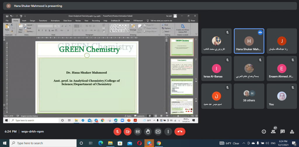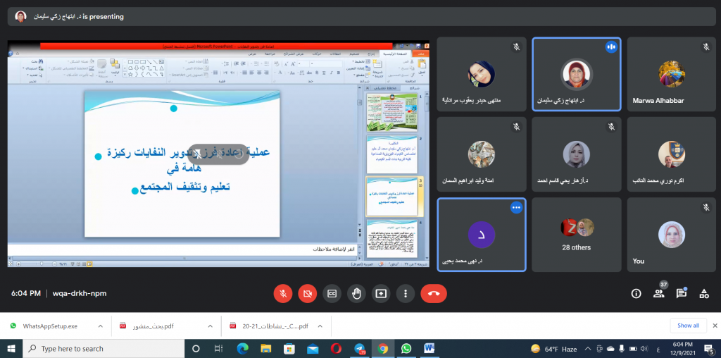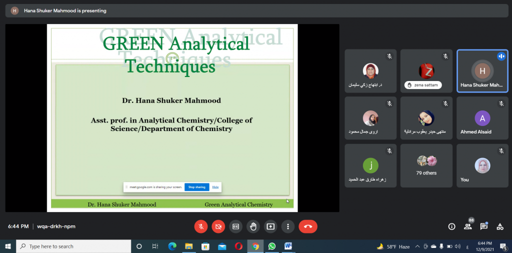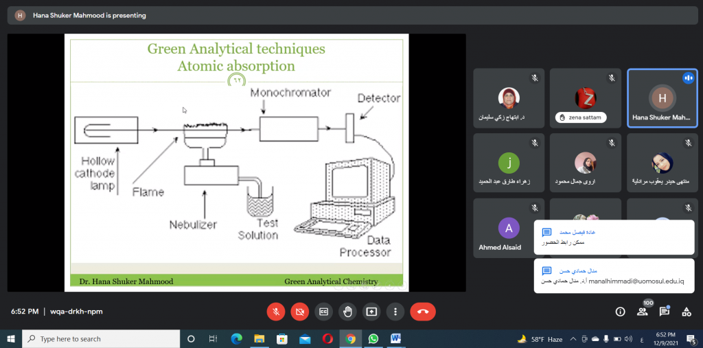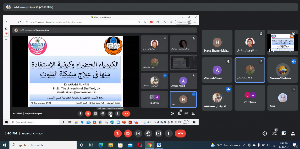 برعاية السيد رئيس جامعة الموصل الأستاذ الدكتور قصي كمال الدين الاحمدي و بإشراف السيدة عميد كلية التربية للبنات الأستاذ الدكتورة ضمياء علي عبد الله و اشراف السيدة رئيس قسم الكيمياء، اختتم قسم الكيمياء في كلية التربية للبنات الدورة الالكترونية الموسومة ” الكيمياء الخضراء ومعالجة النفايات” التي اقيمت بالتعاون مع قسم الكيمياء في كلية العلوم واستمرت ثلاثة ايام 7-9/ 2021/12 وعلى منصة (Google Meet). تضمنت الدورة عدداً من المحاضرات العلمية التي حاضر فيها كل من أ.د. ابتهاج زكي سليمان, أ.م.د. هناء شكر محمود, م.د. اكرم نوري, و م.د. رنا عبد المالك.أوضحت الدورة دور الكيمياء الخضراء في المجال الاكاديمي عن طريق الحد من النفايات من خلال تصنيع مركبات كيميائية صديقة للبيئة ذات سمية ضئيلة أو معدومة للإنسان. اذ تتطلب هذه الطريقة استخدم مواد أولية قابلة للتجديد ومذيبات أمنة وظروف تفاعل اقل تجنبا لاستخدام طرق فصل و تنقية للنواتج. بالإضافة الى تحضير نواتج قابلة للتحلل بعد الاستخدام بحيث لا تسبب الضرر عند تراكمها في البيئة. هذا بدوره يؤدي الى انخفاض كبير في احتمالية حدوث ظاهرة الاحتباس الحراري واستنفاد الأوزون وتكوين الضباب الدخاني بالإضافة الى زيادة سعة المصنع وتوفير الطاقة والمياه من خلال تقليل الخطوات الاصطناعية. تم التعرف على بعض التقنيات التحليلية المستخدمة لهذا الغرض و من ضمنها Atomic Absorption Technique التي تتطلب كمية قليلة من حجم العينة و لا تحتاج الى اضافة كواشف.تطرقت الدورة ايضا الى كيفية معالجة النفايات من خلال عملية اعادة التدوير لما لها من تأثير ايجابي على البيئة و المجتمع بالإضافة الى توضيح بعض النقاط المهمة في المحافظة على نظافة مدينتنا من خلال توعية المجتمع و تنبيهه الى مخاطر تراكم هذه النفايات على المدى البعيد. لاقت الدورة حضوراً مميزاً من معظم تدريسيي وطلاب الدراسات العليا من أقسام و كليات جامعة الموصل.