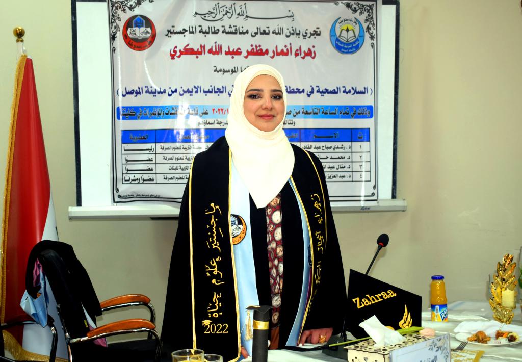 ناقش قسم علوم الحياة بكلية التربية للبنات في جامعة الموصل رسالة الماجستير الموسومة ( السلامة الصحية في محطة إسالة الدندان في الجانب الأيمن من مدينة الموصل) ، للطالبة زهراء أنمار مظفر البكري، يوم الأحد الموافق ٦ / ١١ / ٢٠٢٢ ، في قاعة المناقشات والمؤتمرات في عمادة الكلية .هدفت الدراسة الى تقييم نوعية مياه الشرب لمحطة إسالة الدندان والأحياء السكنية التابعة لها، حيث جمعت 100 عينة مائية لعشرة مواقع اثنان منها قبل (مياه نهر دجلة) وبعد المعالجة والبقية من الاحياء السكنية ابتداء من شهر تشرين الثاني 2021 لغاية شهر شباط 2022 م لإجراء التحاليل الفيزيائية والكيميائية والبكتريولوجي كما عُزلت وشٌخصت بعض أنواع البكتيريا الملوثة للمياه المدروسة وتأكيد تشخيصها باستخدام الجين 16SrRNA))، كما قيمت نوعية المياه باستخدام مؤشر نوعية المياه (OWQI) Oregon Water Quality Index للشرب ،فضلاً عن استخدام موديل مؤشر المخاطر الصحية المحتملة Human Health (HHR) Risk للنترات والفلوريدات.وأشارت نتائج دليل نوعية المياه (OWQI) الى أن المياه كانت ممتازة النوعية بعد المعالجة، بينما كانت بقية مواقع الاحياء السكنية متراوحة بين فئة المياه الممتازة النوعية (Excellent) إلى نوعية جيدة جدا(Very Good) ، فضلا عن عزل وتشخيص كل من بكتيريا (Acinetobacter radioresistens, Bacillus firmus, Pseudomonas aeruginosa). ، أما بالنسبة للتأثير الصحي للنترات والفلوريدات ، ولحسن الحظ كانت القيم ضمن المحددات الامنة للشرب (QI=HI ≤ 1.0) حسب معايير وكالة حماية البيئة الأمريكية US-EPA.وتألفت لجنة المناقشة من الأساتذة :١- الأستاذ الدكتور رشدي صباح عبد القادر رئيسا.٢- الأستاذ المساعد الدكتور محمد حازم صبري عضواً.٣- المدرس الدكتور منال عبد المطلب عبد عضواً.٤- الأستاذ الدكتور عبد العزيز يونس الصفاوي عضواً ومشرفاً.وبعد مناقشة علمية مستفيضة ودفاع الطالبة عن رسالتها أجيزت بتقدير ا