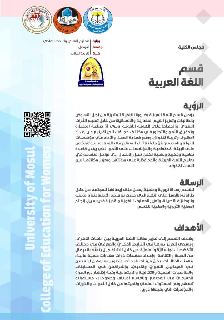 - للقسم رسالة تربويّة وعلميّة يعمل على إيصالها للمجتمع من خلال طالباته؛ بالعمل على النّهج الذي جاءت به قيمنا الاجتماعيّة والدّينيّة والوطنيّة الأصيلة، وتعزيز المعارف اللغويّة والأدبيّة في سبيل إنجاح العمليّة التّربويّة والعلميّة للقسم.