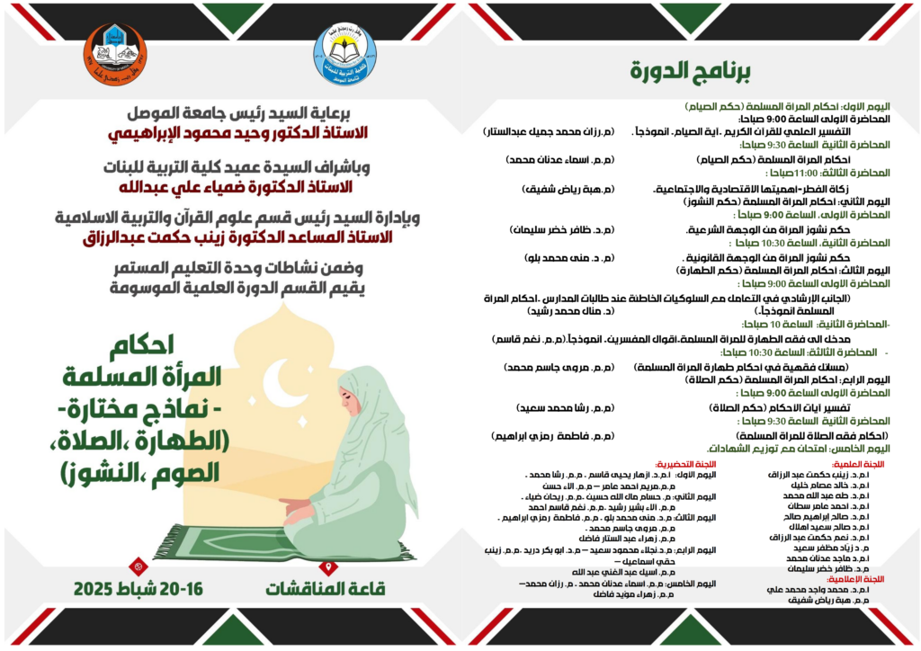 اجتمعت اللجنة الارشادية الاجتماع الاول برئاسة الاستاذ المساعد الدكتورة ازهار يحيى قاسم يوم الاحد الموافق 2025/12/15 في وحدة الارشاد التربوي والنفسي في الكلية وبحضور عضوات الارتباط كل من ا.د غيداء احمد سعدون / قسم اللغة العربية
